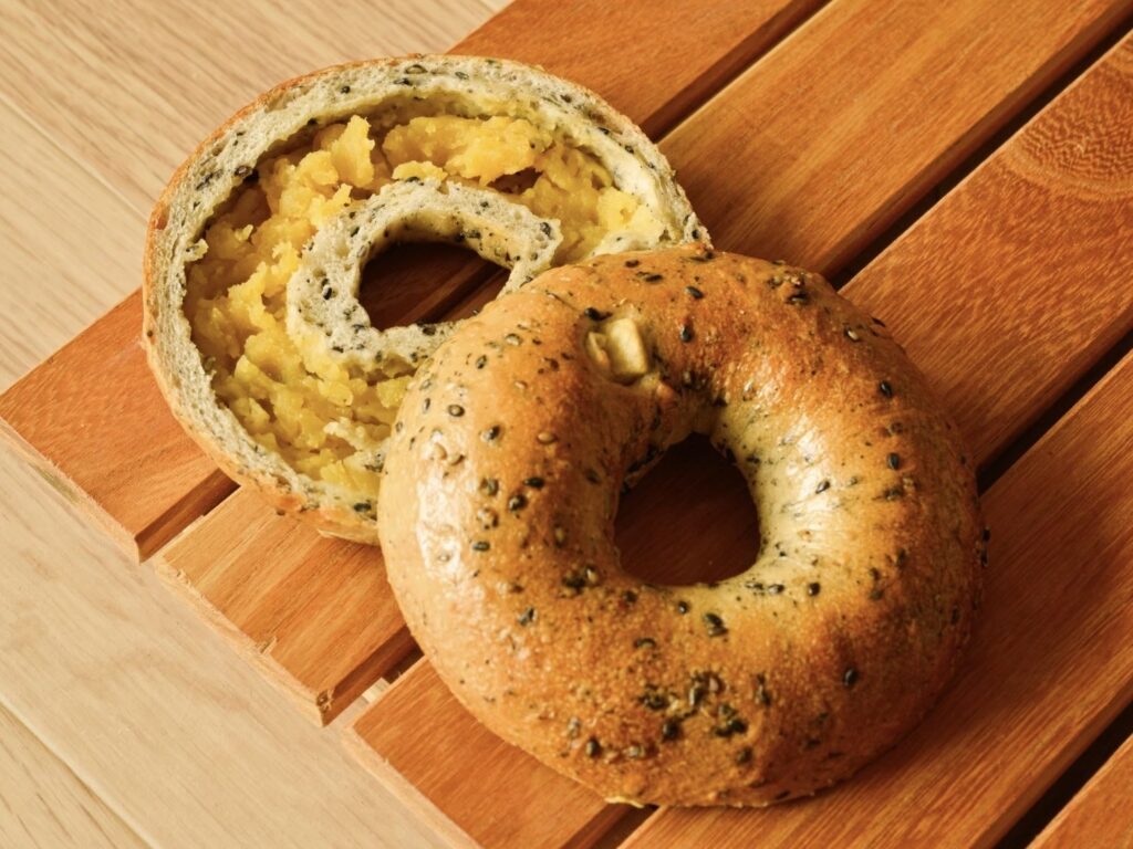 香ばしい黒ごま生地に甘い紅はるかとチーズを包み込みました!あまじょっぱい具材がくせになる🍠🧀秋の味覚をお楽しみください🥯