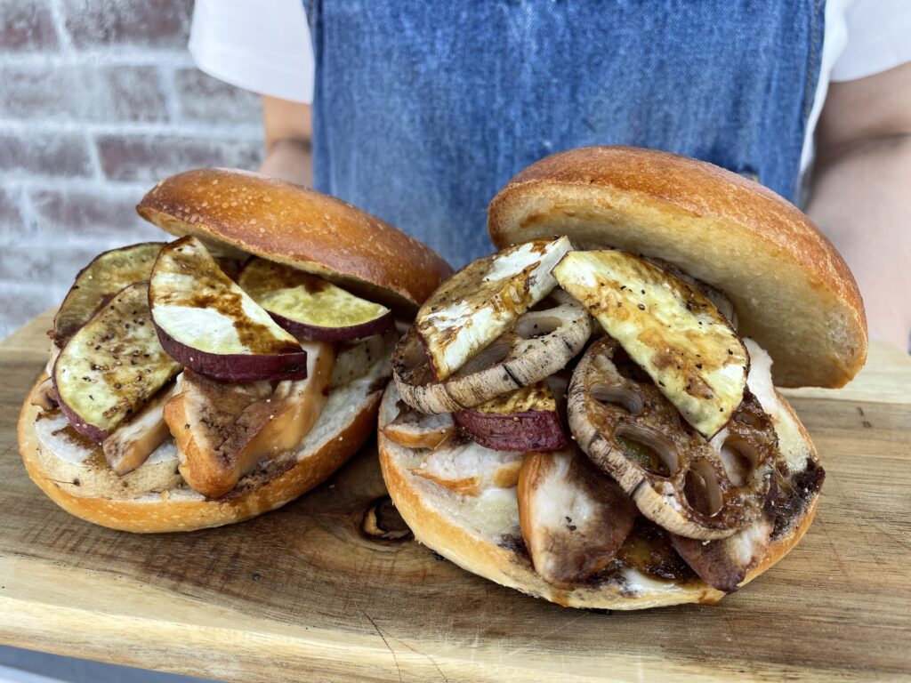 スモークチキンと「金澤美人れんこん」、旬のさつまいもを合わせたホットサンド。バルサミコソースの深いコクが素材の旨みと絶妙に絡み合います。