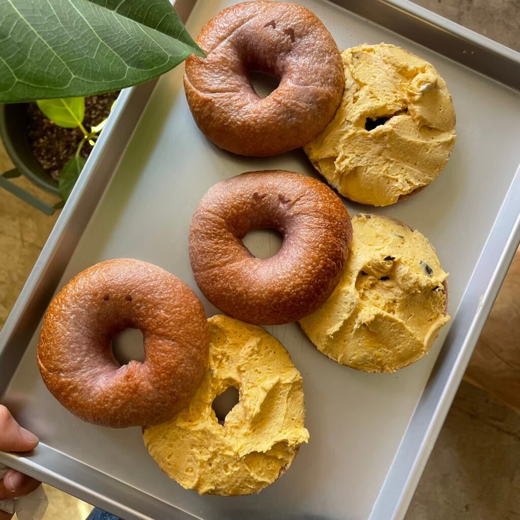 紫芋のベーグルに、北海道産かぼちゃのあんこで作ったかぼちゃクリームをたっぷりとサンド。ほんのりシナモンが香るとっておきのサンドです🎃
