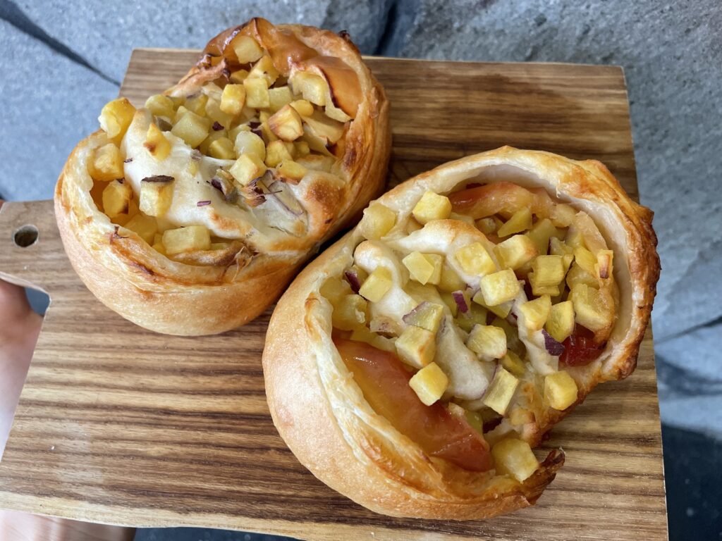 ▶︎沼田の真田りんご園さんの旬の紅玉と、紅はるかをベーグルとデニッシュの生地にたっぷり包みました!もちもち生地とサクサクデニッシュがたまらない!