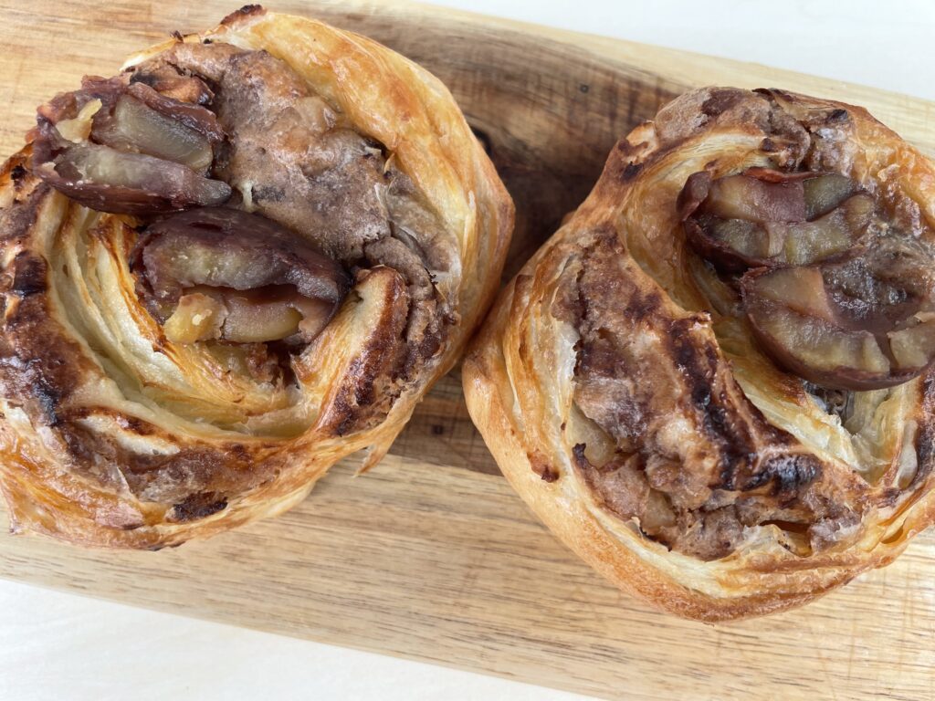ほっくりマロンペーストを、ベーグルとデニッシュの生地にたっぷり巻き込みました!もちもち生地とサクサクデニッシュがたまらない。仕上げに栗の渋皮煮をごろっと。