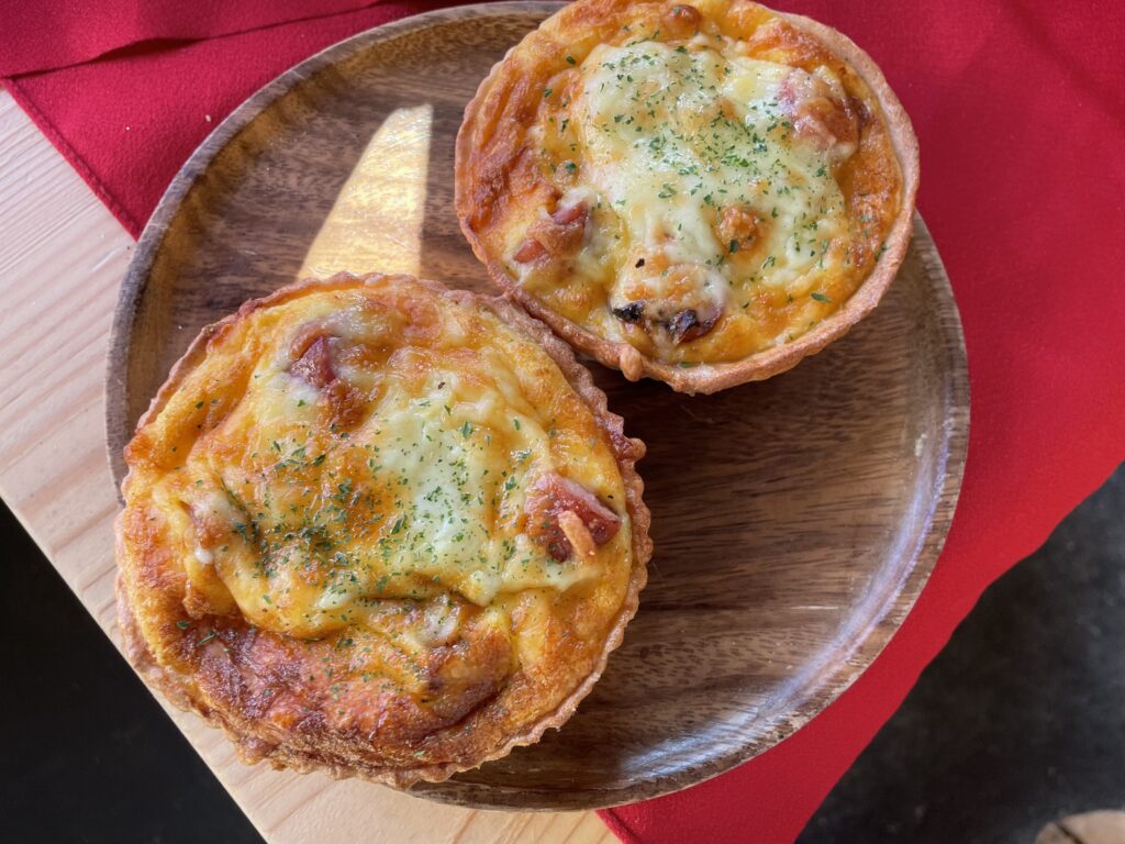 ▶ベーグル生地にたっぷりきのこと、高崎市のハム工房Ticca Toccaさんのウインナー入りのキッシュ生地をたっぷり。ウインナーは榛名ポークなど厳選された材料を使用しています。